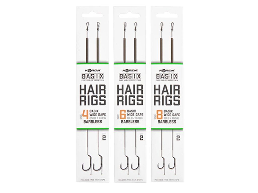 Univerzálně použitelné návazce na kapry Korda Basix Hair Rigs Wide Gape - balené po 2 ks prakticky pro jakékoli použití. Celková délka cca. 15cm. Skvělé univerzální návazce s háčky Wide Gape - lehčí, pevnější, navázané na ztužené šňůrce Korda Basix Coated Hooklink. Dodáváno s několika velikostmi zarážek pro různé velikosti kuliček.