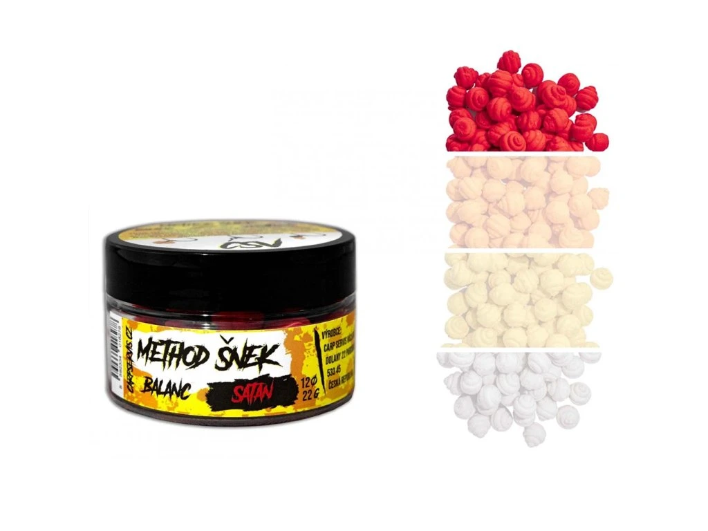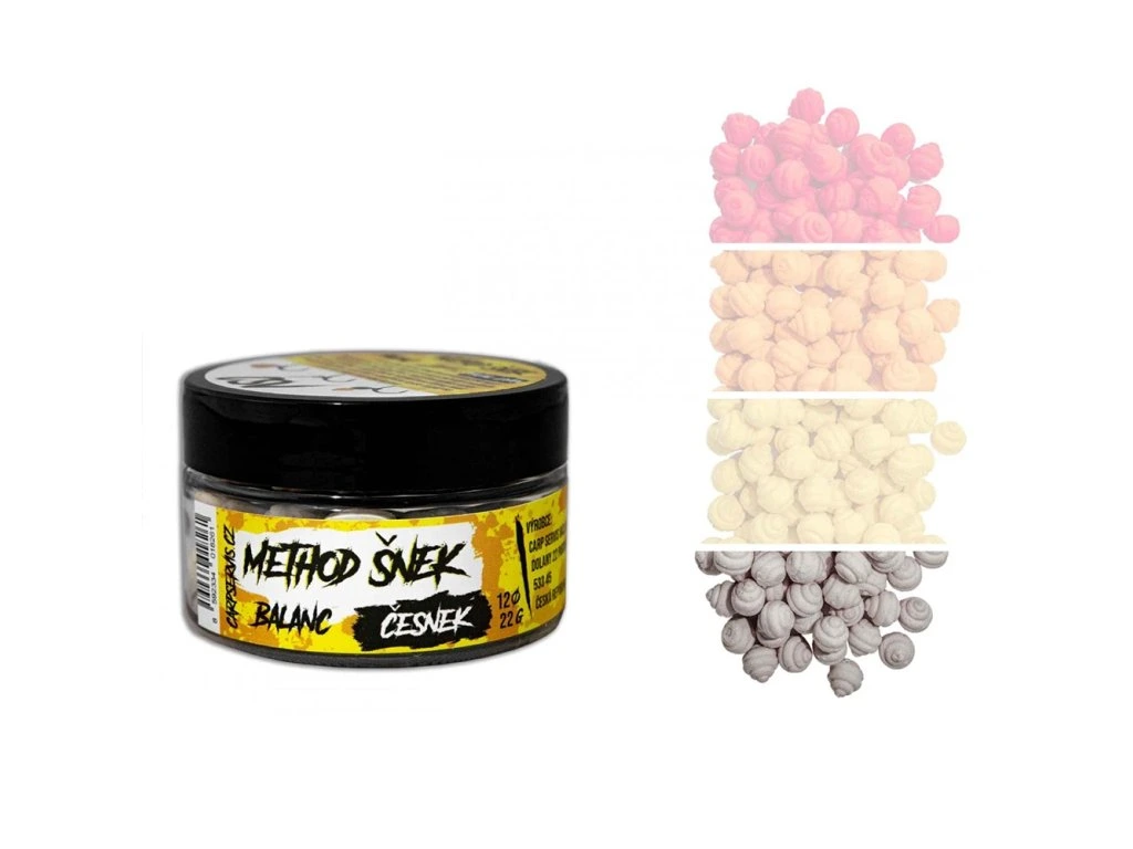 Method šnek balanc - přináší nejen klasické přednosti vyvážených nástrah, ale má i schopnost velmi intenzivního uvolňovování atraktorů a částečnou rozpustnost. Další výhodou je originální tvar, který imituje přirozenou potravu - různé druhy plžů, což je činí neodolatelnými pro většinu, i těch nejopatrnějších kaprovitých ryb. Nástrahu je možné dipovat pomocí Aroma Pop up nebo Aroma speciál od CSV. Aroma prostředky jsou nositelem identických pachových silic, které jsou použity přímo v Method šnek balančních nástrahách. Dostupné v šesti příchutích.