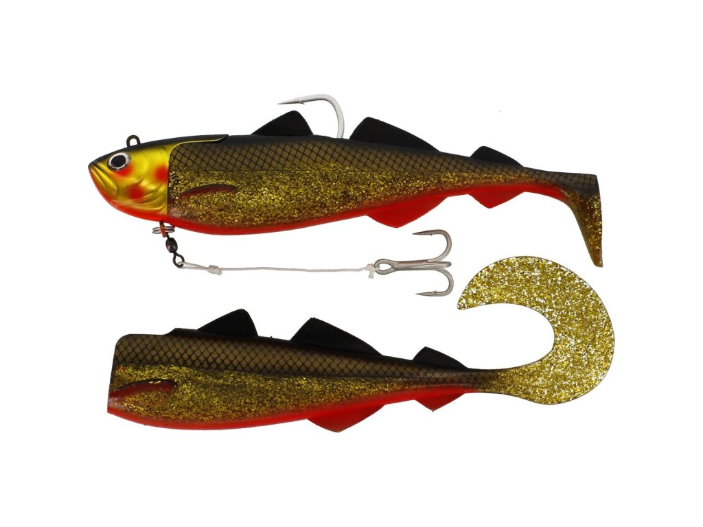 Konstrukčně vychází z tresky tmavé - oblíbené rybí večeře pro velké trofejní exempláře lovící v mořích a na březích kolem Norska. V balení najdete silný a odolný návazec s trojháčkem a dvě různá těla – klasický twister ocas pro pomalý pohyb a ocas typu kopyto, imitující raněnou panickou rybu, který doslova volá sežer mě :-)