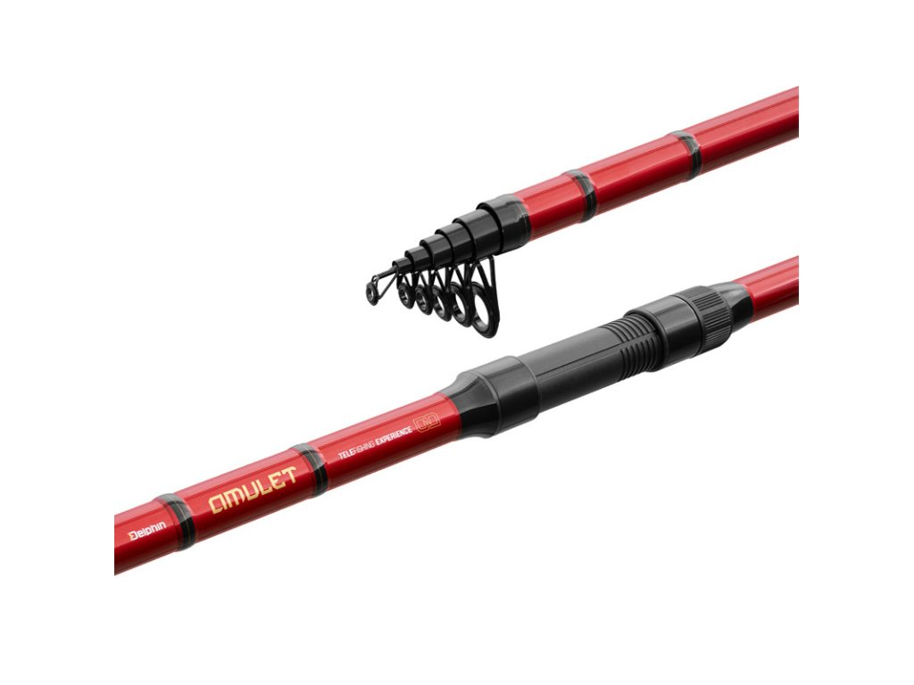 Amulet Tele představuje vstupní bránu do kategorie univerzálních teleskopických prutů. Díky svým vlastnostem a příznivé ceně je skvělou volbou zejména pro začínající či méně náročné rybáře. Základem tohoto modelu je kvalitní blank s parabolickou akcí, který vám poskytne dokonalý požitek i při soubojích s menšími rybami. Zároveň však poskytuje jistotu při nahazování či zdolávání větších úlovků. Všechny výsuvné díly jsou osazeny pevnými očky se SiC výplní, které zajišťují hladký chod vlasce při nahazování. Sedlo navijáku je navrženo tak, aby spolehlivě udrželo rybářské navijáky na svém místě. Výsuvné díly a očka jsou v černém barevném provedení, což v kombinaci s vínově červeným blankem na spodním díle vytváří elegantní vizuální celek. Na spodní části rukojeti je použit EVA materiál, který zlepšuje úchop a pohodlí při nahazování.