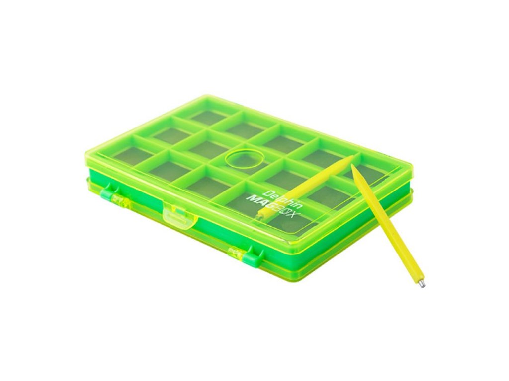 Pomůcka, bez které se neobjede žádný rybář. To je magnetická krabička Delphin MAGBOX, kde uložíte všechny drobné kovové součásti vaší výbavy, samozřejmě nejhojněji zastoupené právě rybářskými háčky. Krabička je oboustranná, na jedné straně se nachází 10 větších (2,5x2,2cm) přihrádek a na druhé 15 menších (2,1x1,3cm). Využitelné ale i pro obratlíky či karabinky. Na základě velikosti či jiných preferencí si jej můžete jednoduše roztřídit do jednotlivých přihrádek, odkud se zaručeně nerozsypou. Navíc se mezi sebou netupí! Budou na svém místě držet až do momentu, kdy se je rozhodnete pomocí přiloženého nástroje použít. Krabička je ve výrazném barevném provedení, a tak nedojde ani k její ztrátě a všechno důležité máte vždy po ruce.