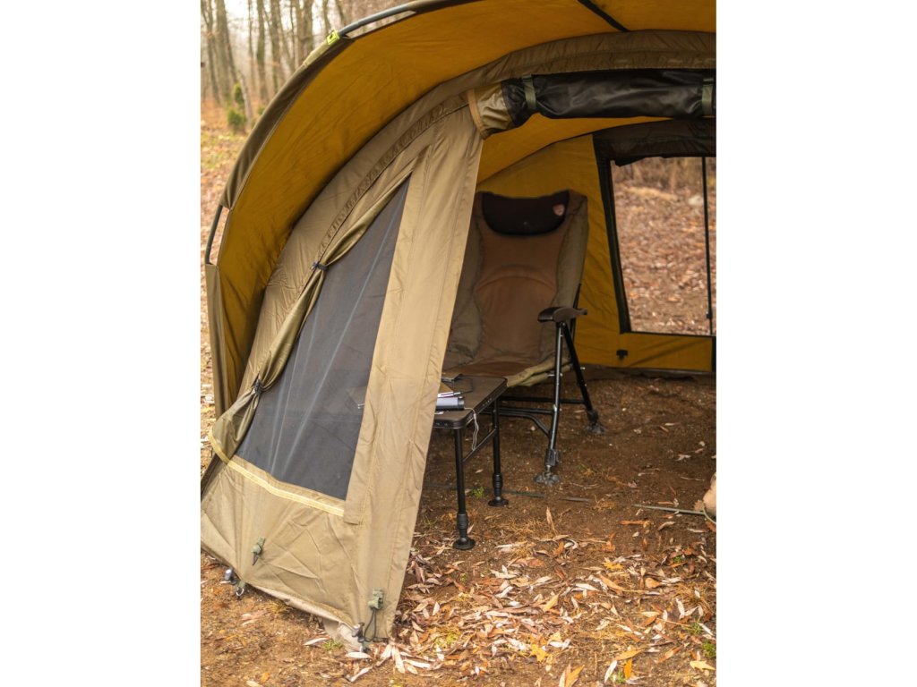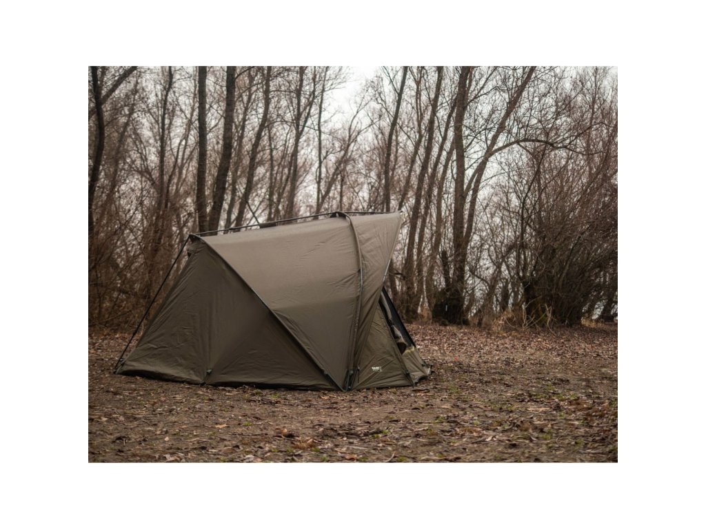 Přístřešek trubkové konstrukce, která se skládá ze tří žeber a o výztuhu se starají rozpěrné tyče. Na tento bivak, byl použit vodě odolný materiál 5 000mm HH, té nejvyšší kvality, který je 100% nepromokavý. Páskou podlepené švy a ukotvení na zavrtávací kolíky, které jsou v ceně přístřešku. Bivak je vybaven větracím systémem jak v přední části, tak velkým oknem v zadní části, které zajistí maximální odvětrání. Velký přední kšilt nad vchodem, je navíc osazen dvěma praktickými úchyty na pruty. Přední vchodová část má tři výměnné panely na suchý zip, celo zakrytá, slída nebo moskytiéra. Další vychytávkou tohoto bivaku je, že v nepřízni počasí můžete ve vchodové části vytvořit okénko, díky použití dvojitých jezdců zipu. Další praktická věc, celí přední panel lze odepnout pomocí zipu a máte otevřený přístřešek. Přístřešek je dodáván s podlážkou, která se k bivaku připne pomocí suchých zipů. Pro lepší a snadnou orientaci osazení podlážky do bivaku, jsme nechali našít 3D označení vstupu. Součástí bivaku je přepravní nylonová taška. Rozměry: Délka: 248cm Šířka: 308cm Výška: 150cm Hmotnost: 10kg Transportní rozměr: 110x20x20cmDoplňkové parametry