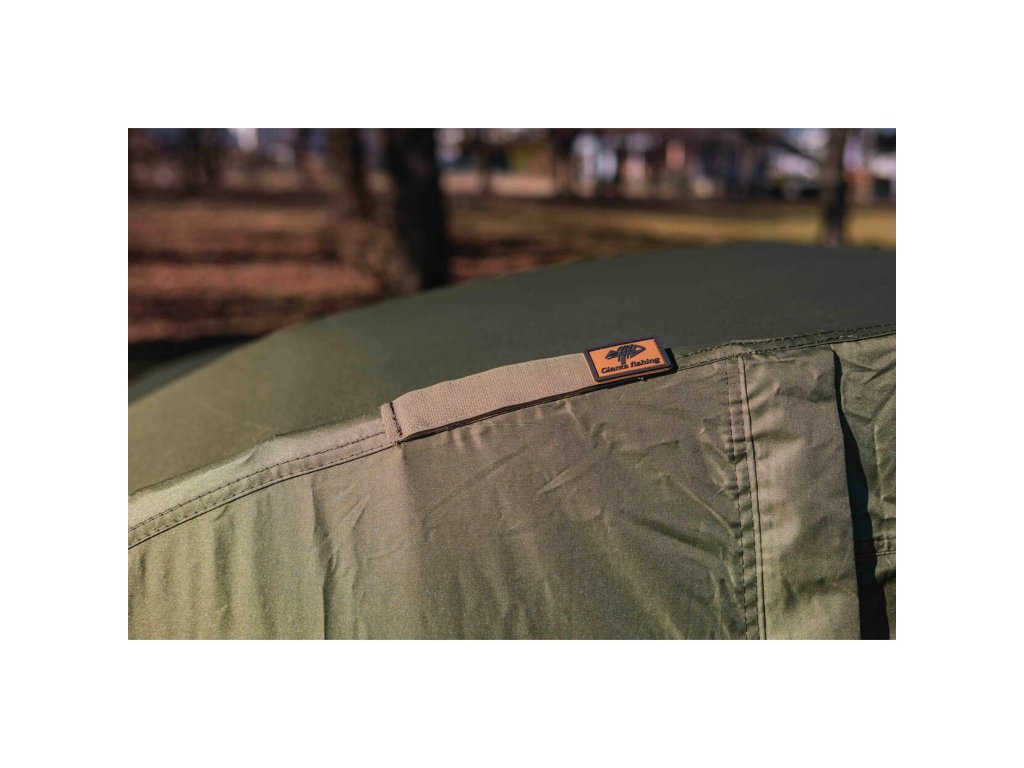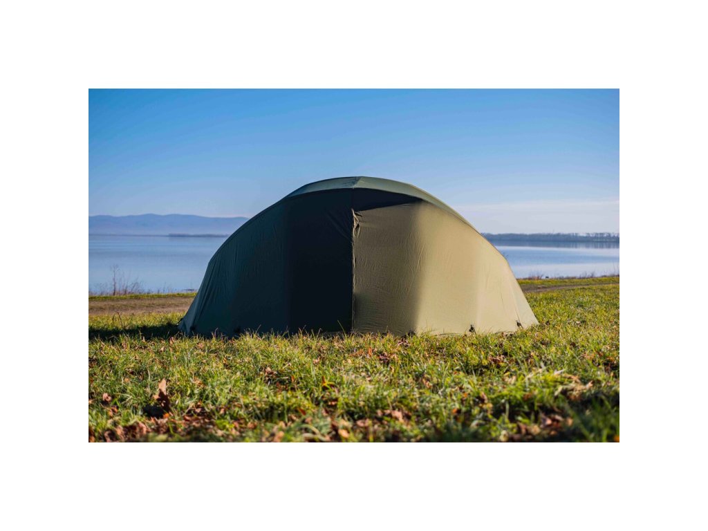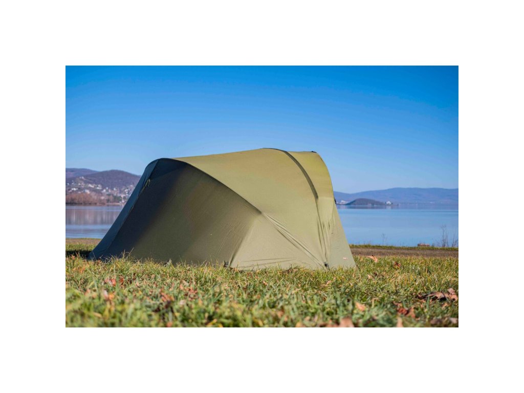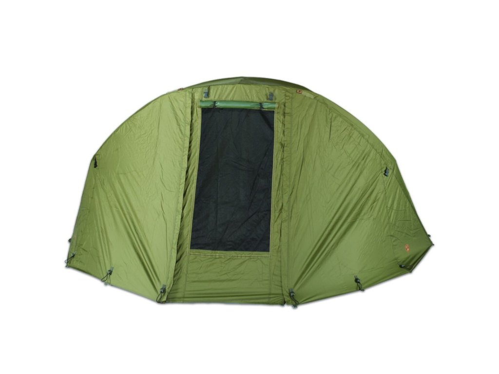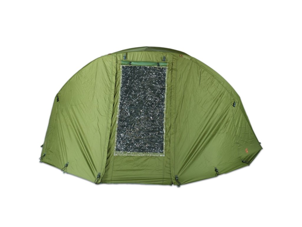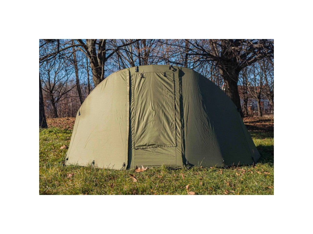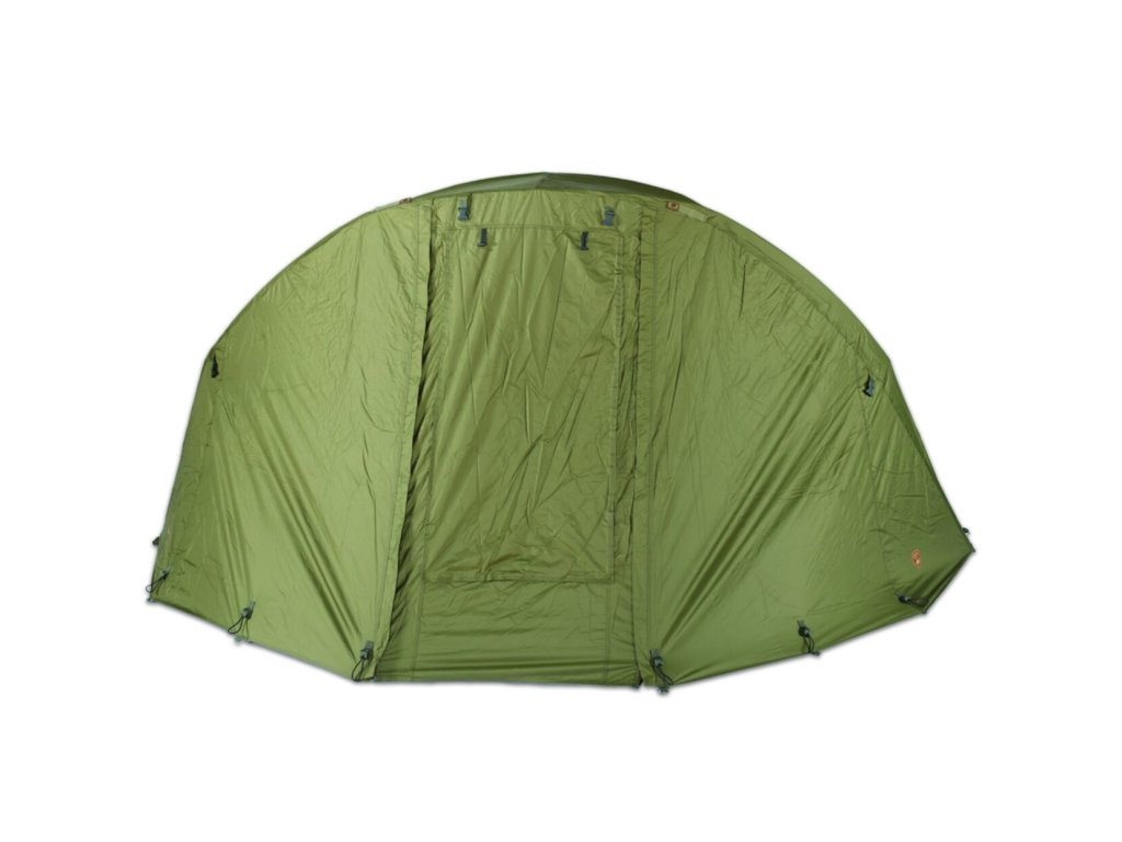 Plášť navíc po natažení na bivak a ukotvení vytvoří v přední části, tedy před bivakem, předsíňku, která je ideální na ponechání zavazadel, které nemusíme mít ve vnitřním prostoru bivaku. Hlavní vstupní panel nabízí plný panel, moskytiéru, či lze připevnit pomocí suchého zipu i slídový panel. Po obou bocích v přední části naleznete dva držáky prutů, které je fixují pomocí suchých zipů. Rozměry: Délka: 248cm Šířka: 308cm Výška: 150cm Hmotnost: 4,8kg Transportní rozměr: 66x22x16cmDoplňkové parametry
