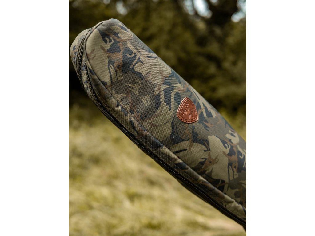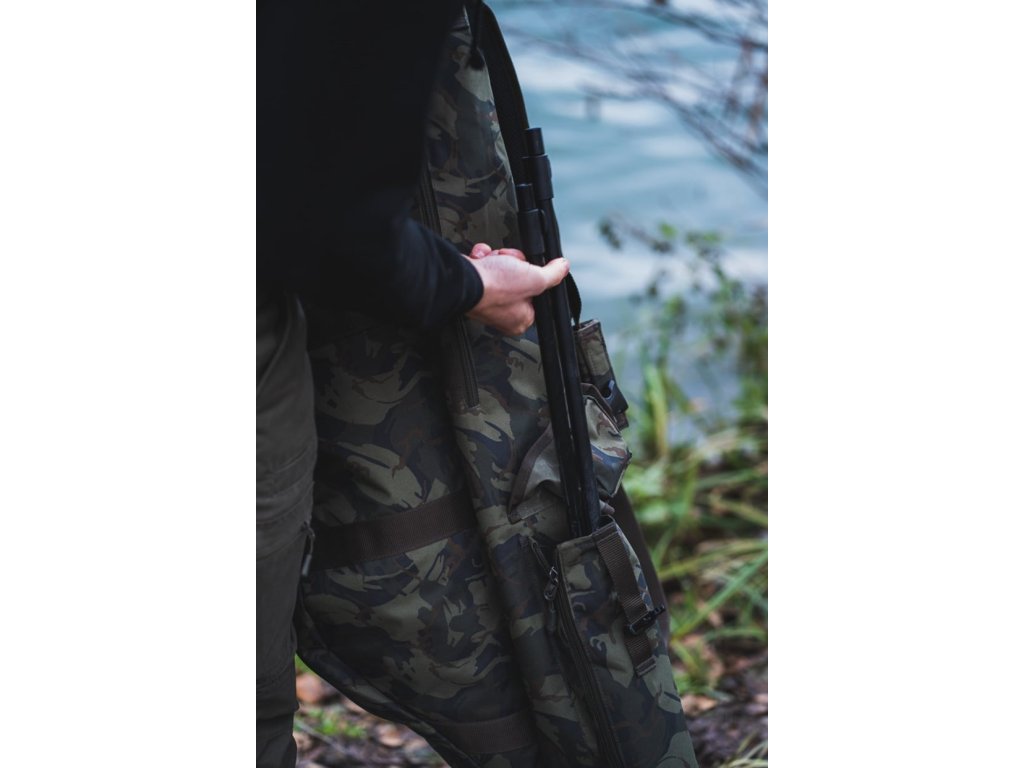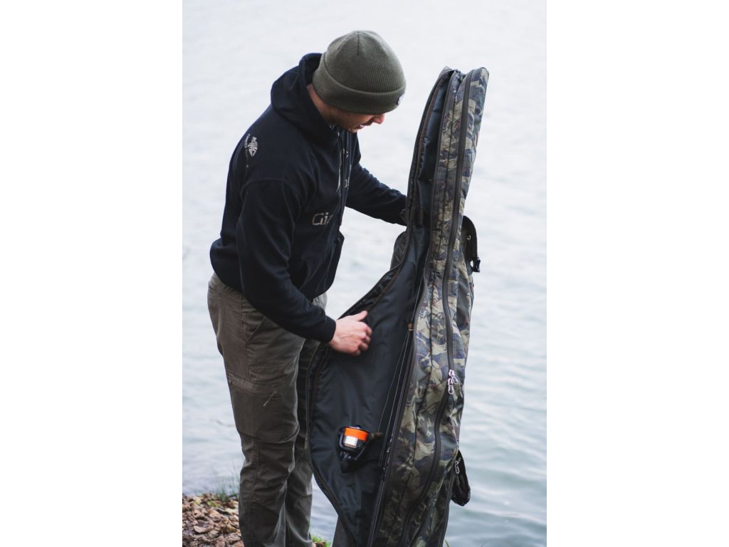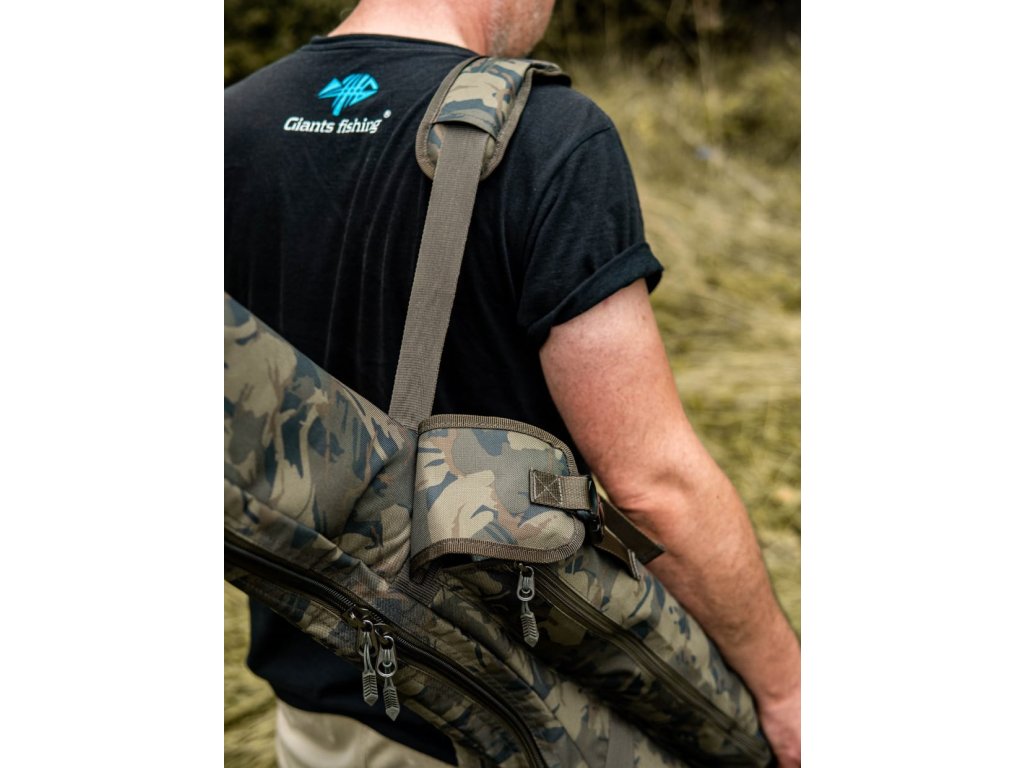 Maximální ochrana pro dva dvoudílné pruty včetně navijáků (bez problému se vejdou i velkokapacitní navijáky). Kvalitní a široké zipy po celé délce, které zajistí dlouhou životnost tohoto pouzdra. Provedení v atraktivním kamuflážovém vzoru a použitý materiál nylon 210D s vodě odolným provedením. Samozřejmostí je polstrované provedení, které zajistí maximální ochranu Vašich prutů s navijáky. Hlavní popruh přes rameno je délkově nastavitelný a částečně polstrovaný. Z jedné strany jsou dvě kapsy, ta delší je určená na podběrák a ta kratší na vidličky. Z druhé strany naleznete částečnou kapsu se stahovacím popruhem pro uchycení deštníku. Tento obal je určen pro dva dvoudílné kaprové pruty v délce 3,6m (12ft). Délka: 210cmDoplňkové parametry