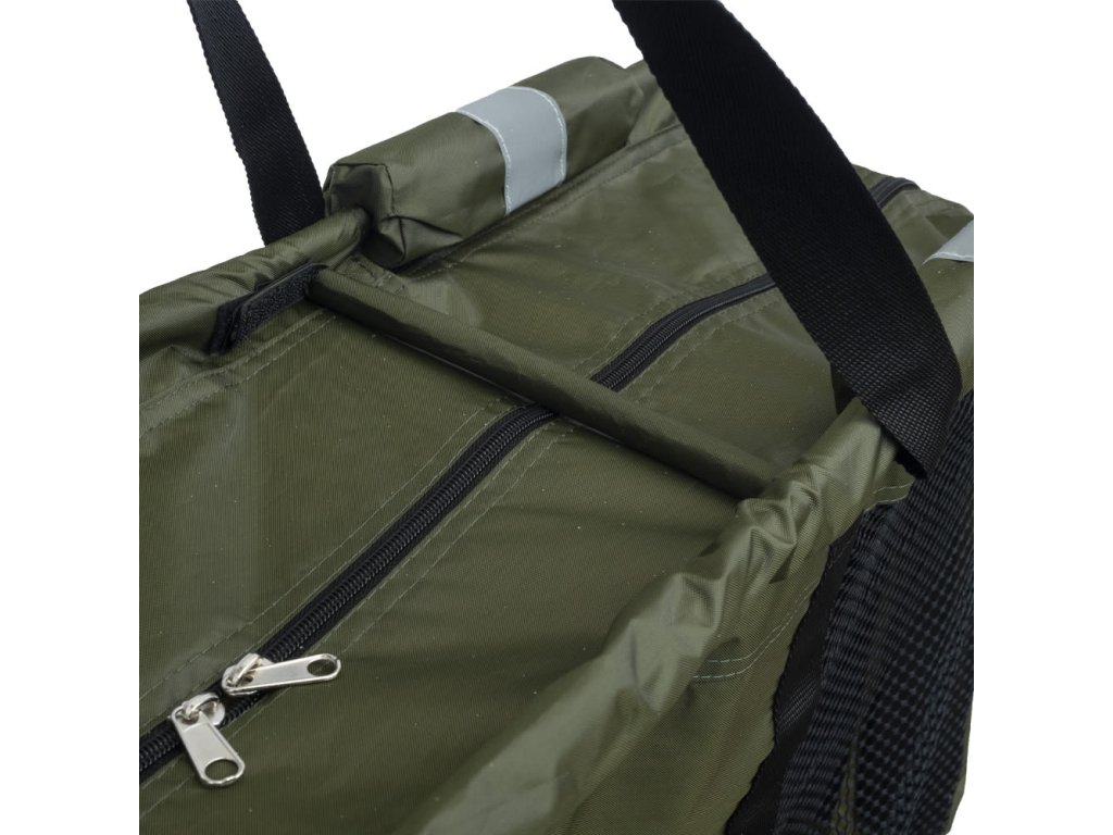 Vážící sak má čtyři plováky, které mají reflexní pásky pro snadnou viditelnost v noci. Ve vrchní centrální části je dvojitý popruh, který je zakončen ocelovými kroužky a je určen k připojení váhy. Dvojité zipy jsou po celé délce. Velký důraz, byl kladen na síťové otvory, aby k úlovku proudil dostatek prokysličené vody. Z obou boků saku jsou plastové „D“ kroužky, na které je možno připojit 3m lano, které je zakončeno plovákem s plastovým kolíkem, který je určen k zajištění saku u břehu. To vše je ukryto v kapsičce na suchý zip. Je dodáván včetně nepromokavého obalu, který je zevnitř pogumovaný, takže zabrání úniku vody a pachu ze saku. Rozměry: Délka: 120 cm Šířka: 29 cm Výška 65 cm Hmotnost: 1,1 kg Barva: zelenáDoplňkové parametry