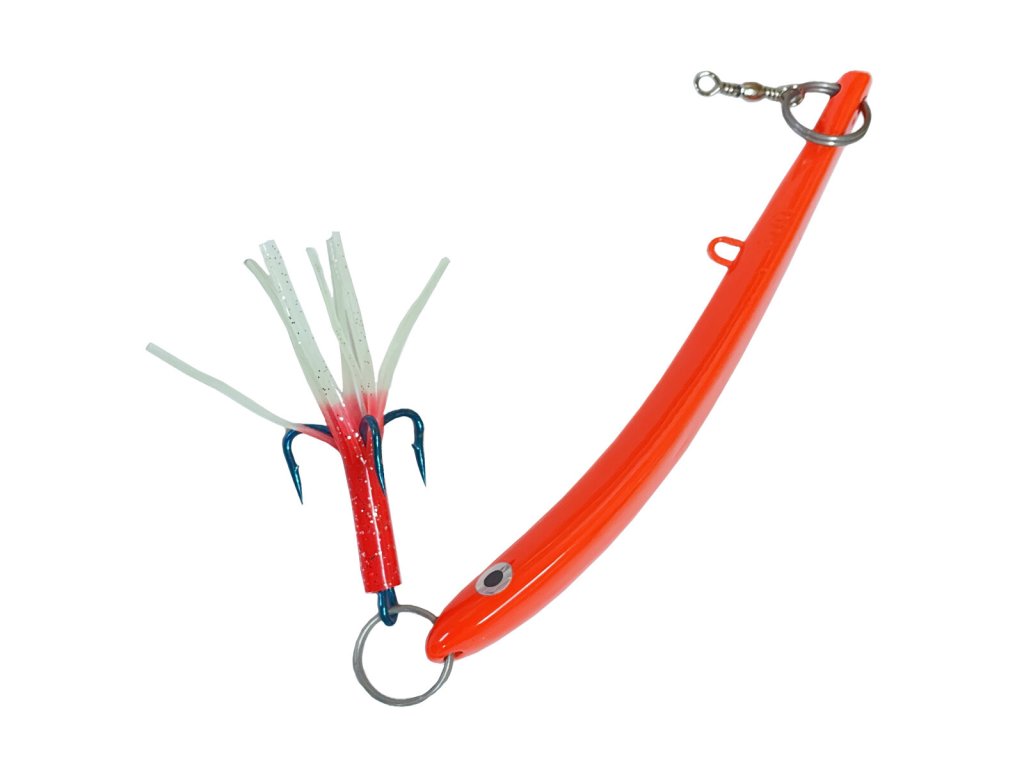 Nové velikosti a provedení populárního olověného pilkru - BANÁN pro mořské rybaření. Barveno novými odolnými barvami s vysokým leskem. Nový ostřejší a pevnější trojháček s dráždivou chobotničkou. Dostupný v červené a stříbrné barvě.