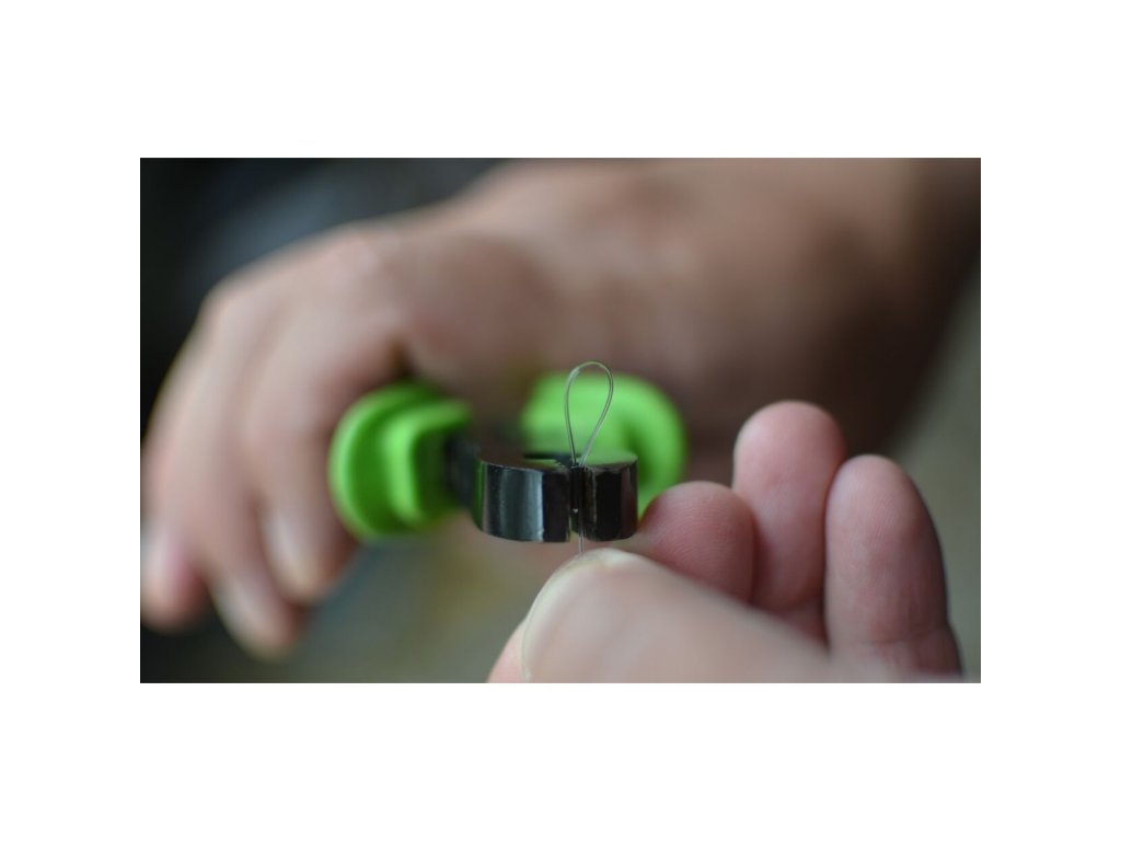 Jednostranný odháčkovač, pod praktickým krytem s očkem pro zavěšení je ocelová ostrá jehla, se kterou se dají rozmotat i zatažené uzlíky na vlasci.