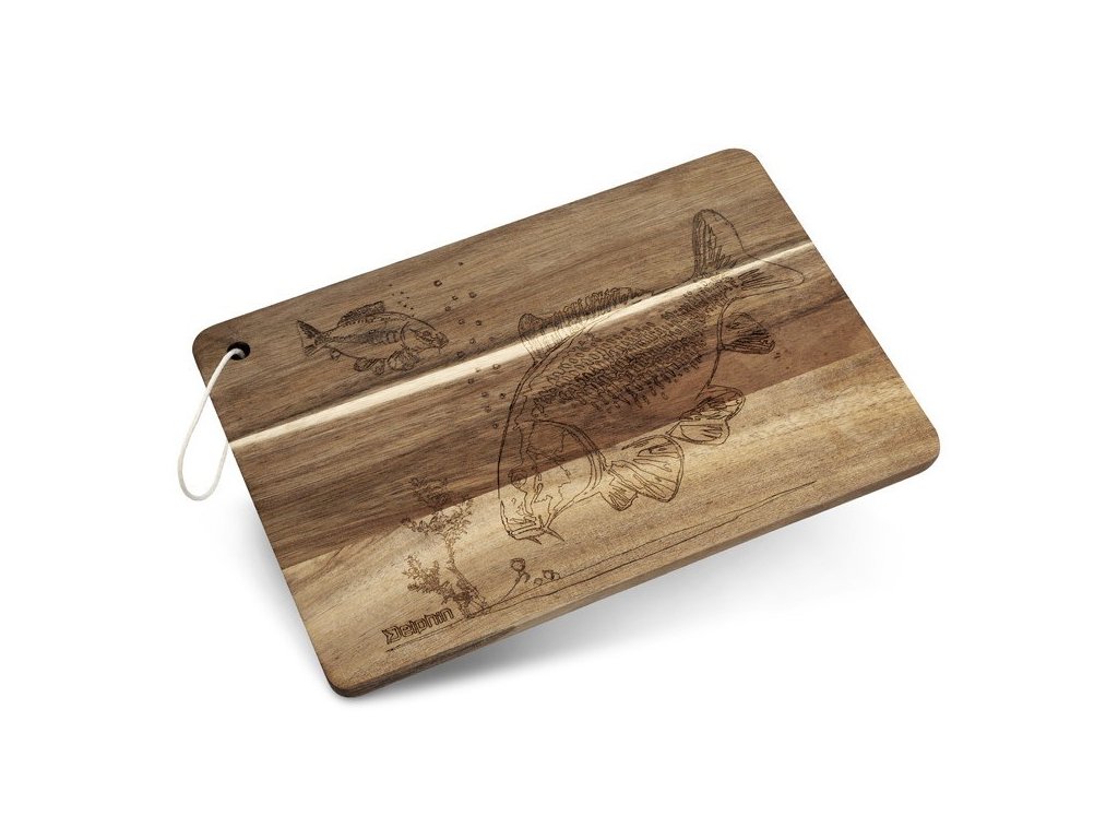 Dekorační kuchyňská deska Delphin CarpBOARD je vyrobena z akáciového dřeva, které je známé svojí vysokou odolností, tvrdostí a krásnou přírodní kresbou. Díky husté struktuře a přirozeným antibakteriálním vlastnostem si zachovává vysokou hygienickou úroveň, což z ní činí praktický doplněk do každé kuchyně, ale také na vaše rybářské výpravy. Deska je zdobená detailním laserovým gravírováním krmících se kaprů, čímž spojuje funkčnost s estetikou. Díky otvoru pro zavěšení se šňůrkou ji lze jednoduše uskladnit nebo použít jako dekoraci.