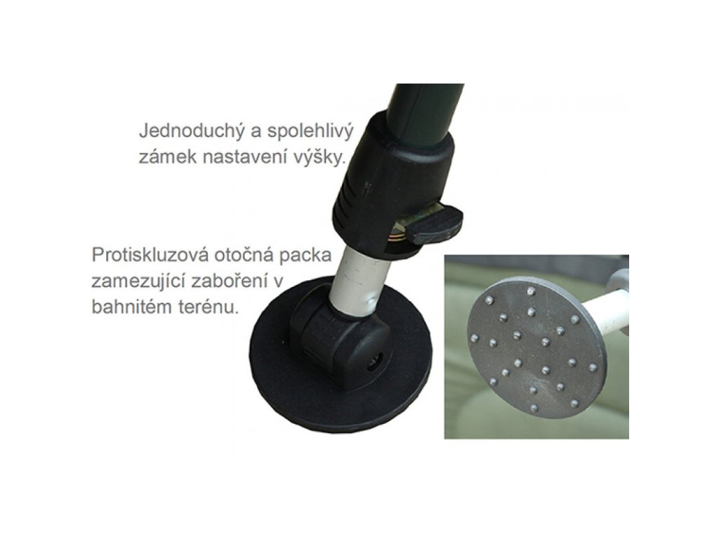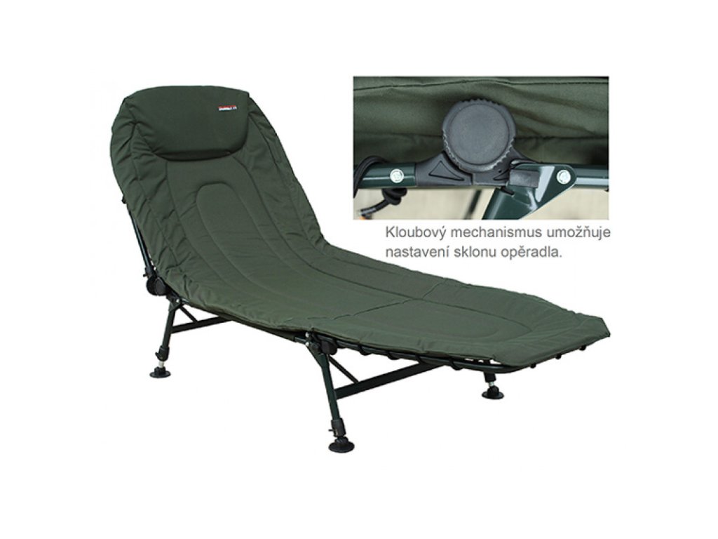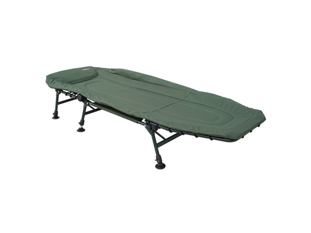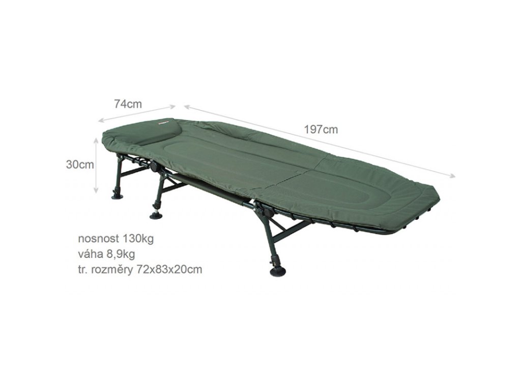 Lehátko Fishmaster s třemi páry nohou, ocelovou konstrukcí a matrací z 600D Oxford-Nylonu s termoizolační vrstvou. Lehátko má klouby sklonu zad, packy nohou s protiskluzovým dezénem, aretaci nohou proti jejich sklopení a jednoduchý stavitelný zámek.