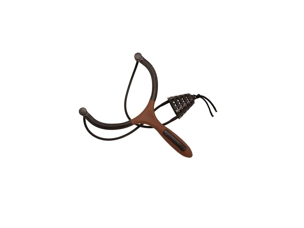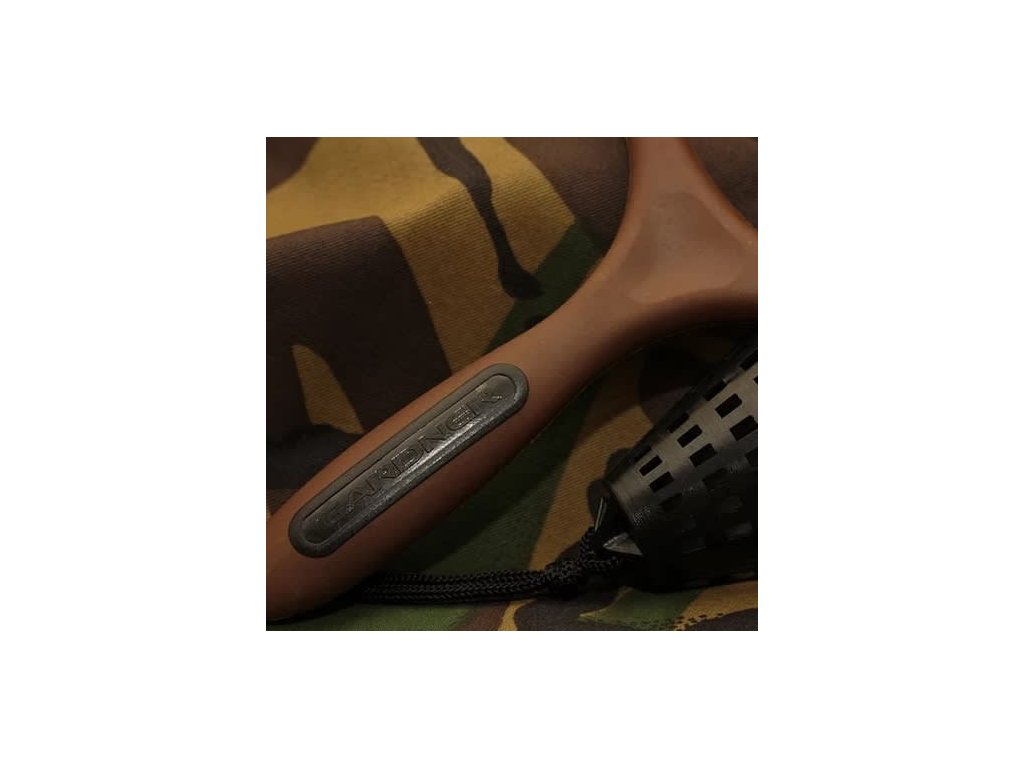 Rybářský prak s anatomicky tvarovanou rukojetí, vybavený gumou 7mm pro zakrmování na vzdálenost až 70 m pro středně velké dávky vnadící směsi.
