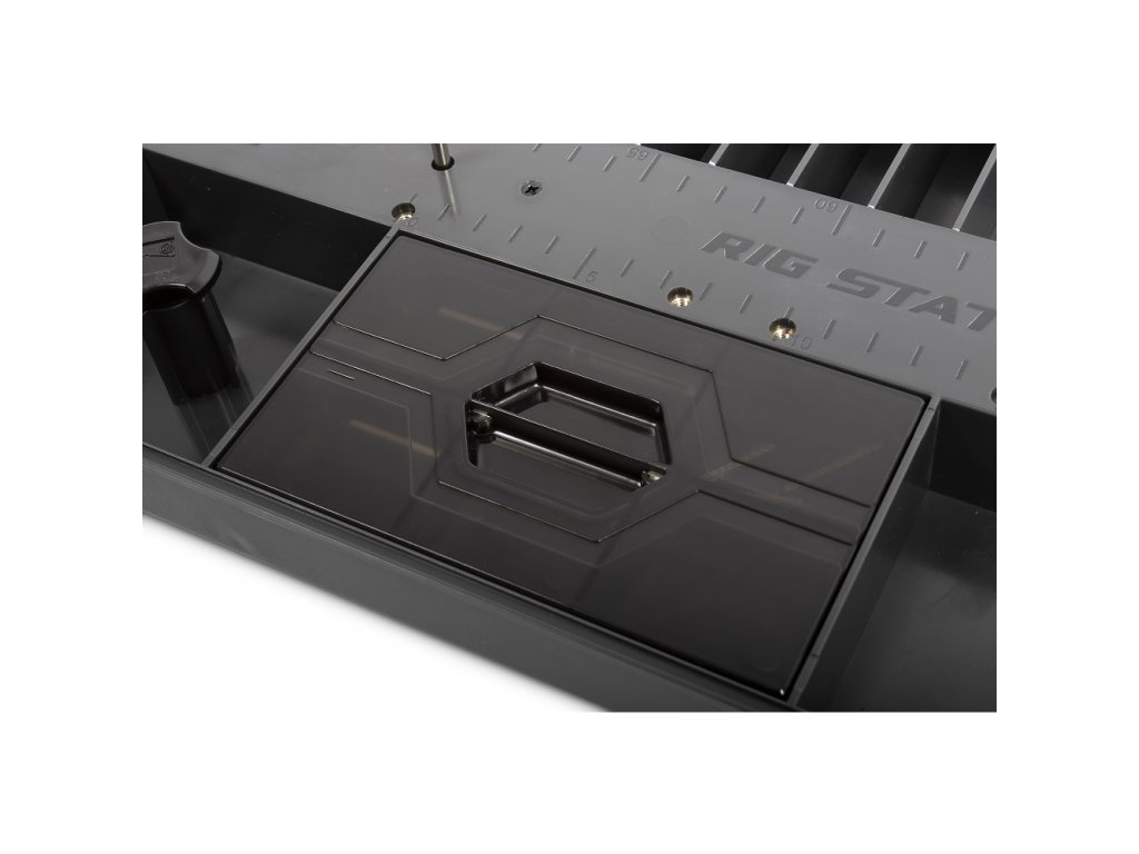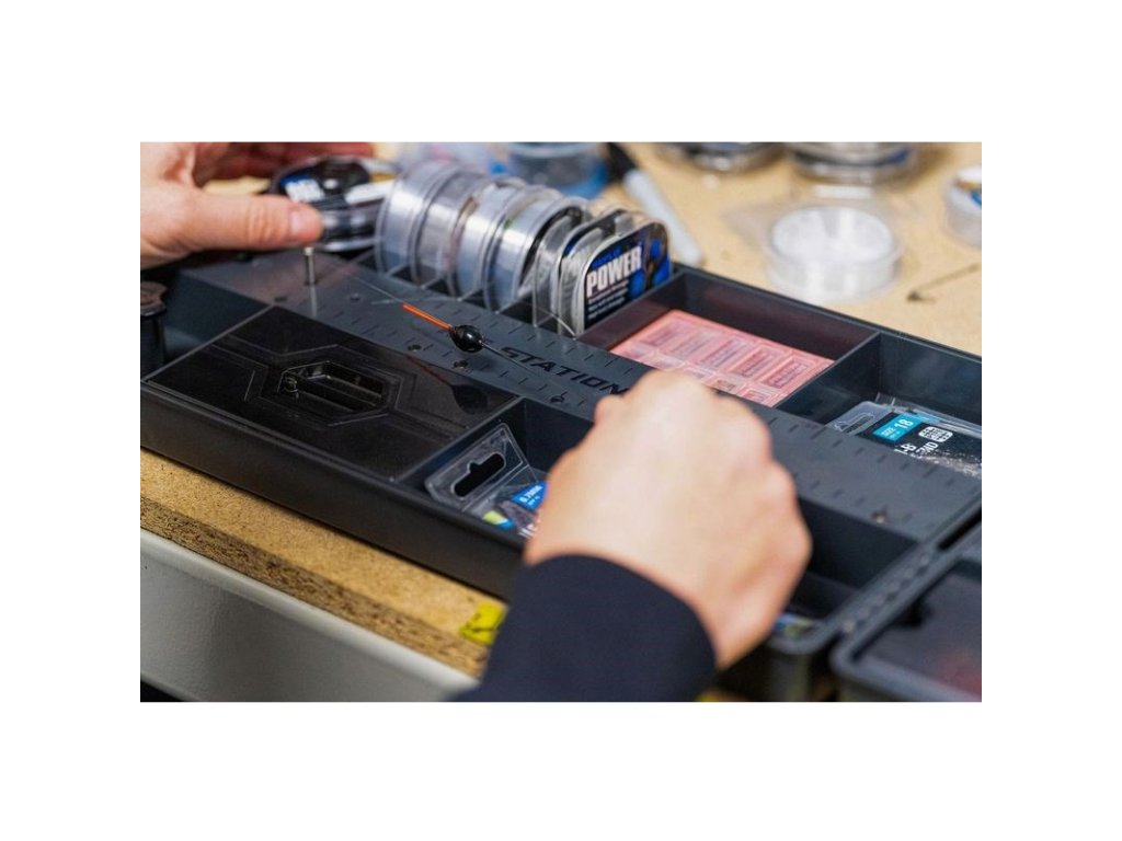 V boxu Rig Station je vyhrazený prostor, kam lze umístit cívku s vlascem a následně jej připevnit ke kolíčkům, aby se vlasec udržel natažený. K dispozici jsou také vyjímatelné kolíčky, které lze do Rig Station našroubovat pro případ že preferujete konkrétní délky. Pomocí tohoto systému lze vázat přesné návazce až do délky 70cm .