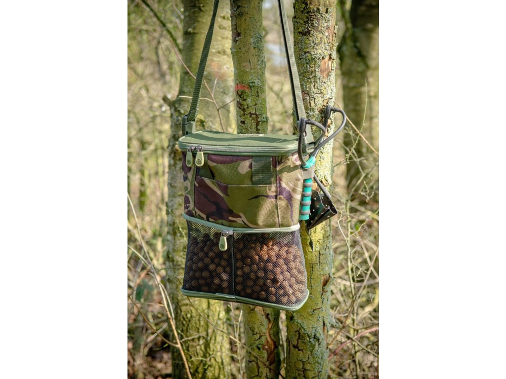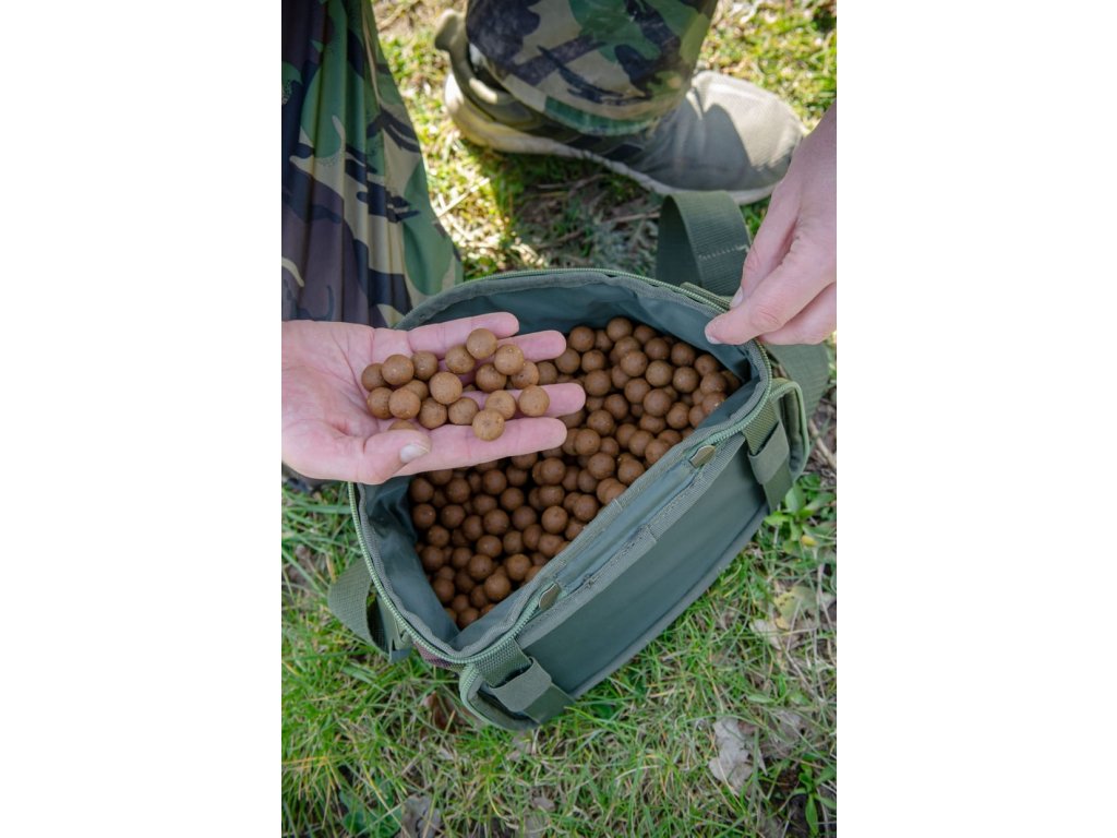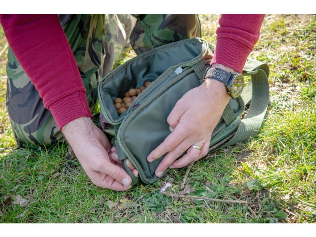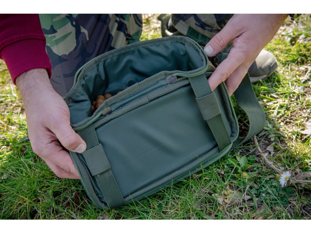 Lze ji použít jak taška přes rameno, nebo třeba i přes pás. Díky chytrému designu po otevření víka je možné toto víko zabezpečit gumovými pásy a tím mít jednoduchý přístup ke krmení. Nechybí ani boční popruh na prak. Další vychytávkou je vnitřní spodní kapsa na zip, která po otevření nabídne komoru se síťovinou pro možnost sušení krmení. Stačí ji pouze zavěsit na bivak nebo strom. Rozměry: - materiál 1200D nylon - možnost nošení přes rameno nebo kolem pasu - elastický popruh pro uchycení praku - ve spodní části síťovina po otevření zipu pro možnost sušení krmení - zipy Bespoke - vysoce odolný materiál, který je lehce omyvatelný - rozměry: 250 mm x 180 mm x 130 mm - barva: zelenáDoplňkové parametry