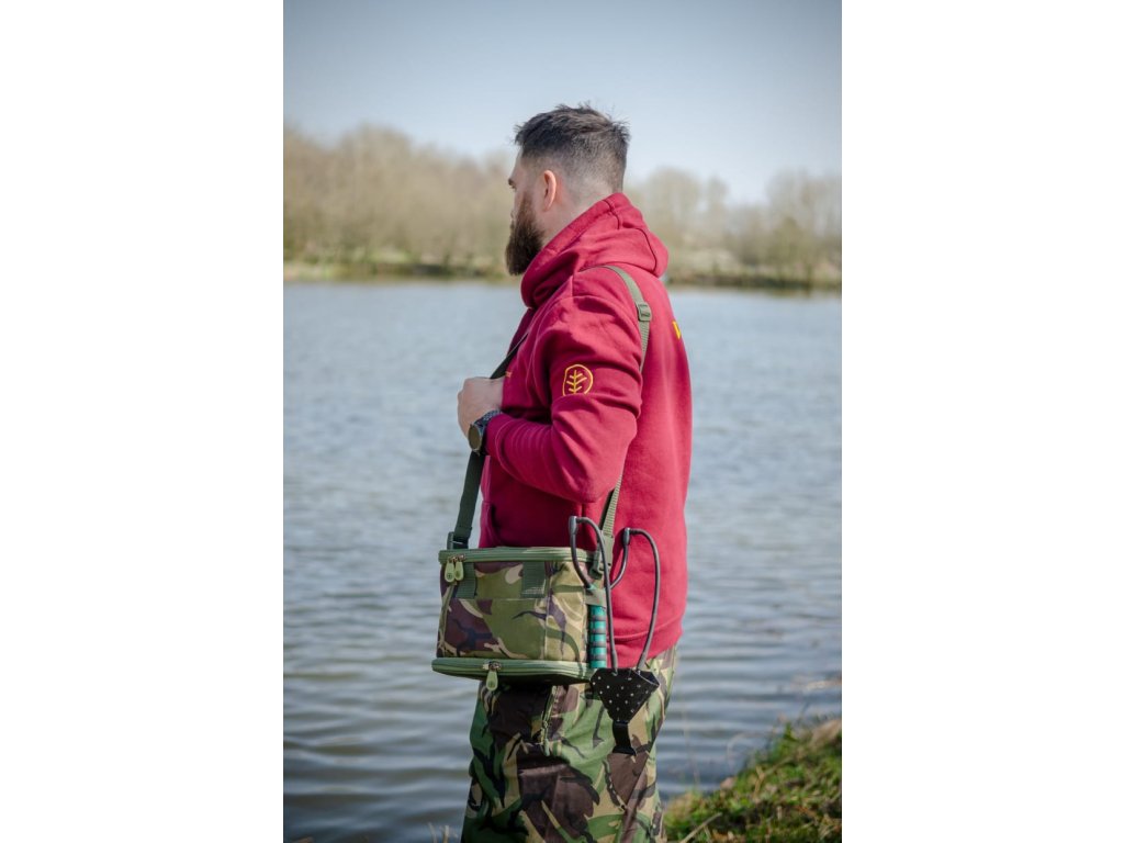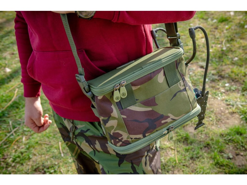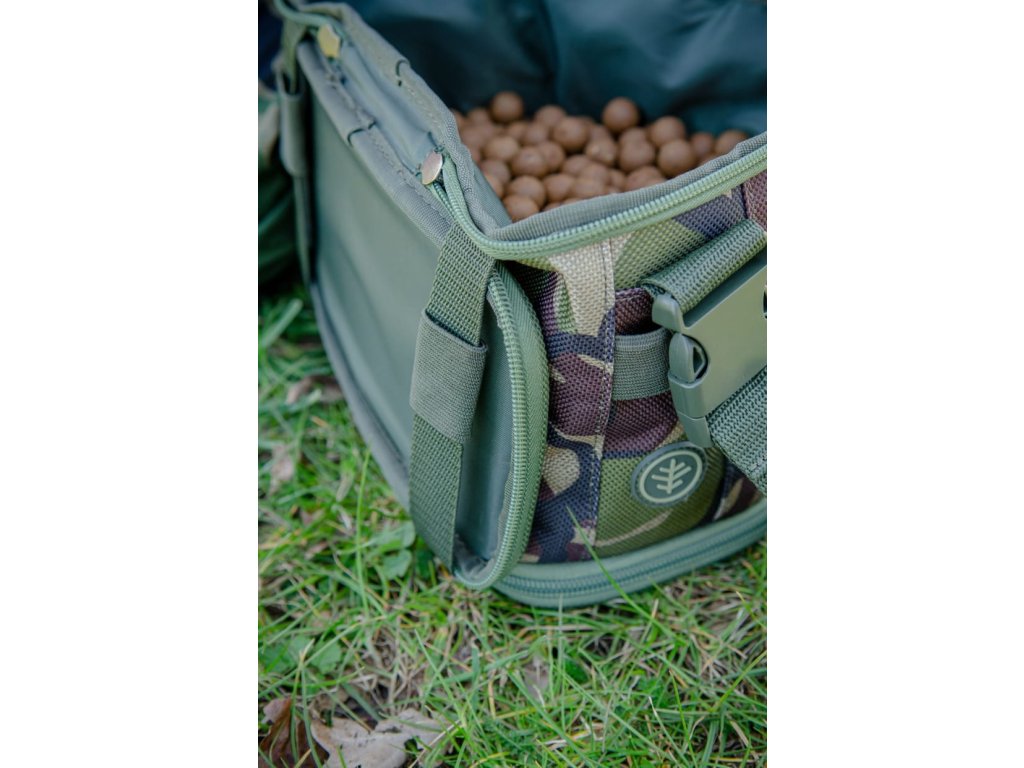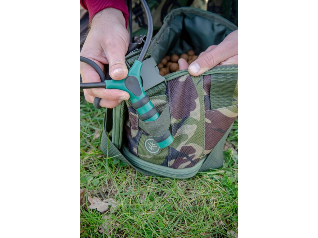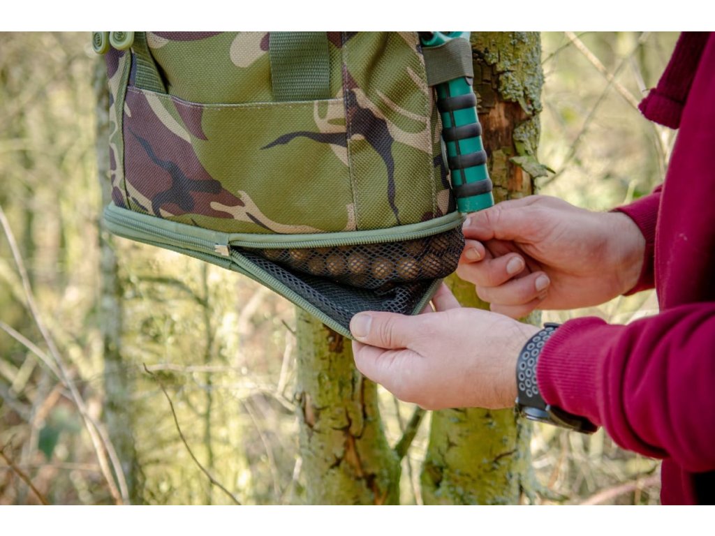 Lze ji použít jak taška přes rameno, nebo třeba i přes pás. Díky chytrému designu po otevření víka je možné toto víko zabezpečit gumovými pásy a tím mít jednoduchý přístup ke krmení. Nechybí ani boční popruh na prak. Další vychytávkou je vnitřní spodní kapsa na zip, která po otevření nabídne komoru se síťovinou pro možnost sušení krmení. Stačí ji pouze zavěsit na bivak nebo strom. Rozměry: - materiál 1200D nylon - možnost nošení přes rameno nebo kolem pasu - elastický popruh pro uchycení praku - ve spodní části síťovina po otevření zipu pro možnost sušení krmení - zipy Bespoke - vysoce odolný materiál, který je lehce omyvatelný - rozměry: 250 mm x 180 mm x 130 mm - barva: zelenáDoplňkové parametry