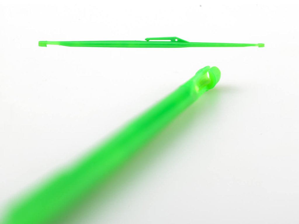 Zesílená jehla bez záklopky z fosforeskujícím plastovým držákem, díky čemuž jí snadno najdete i během nočního rybolovu.